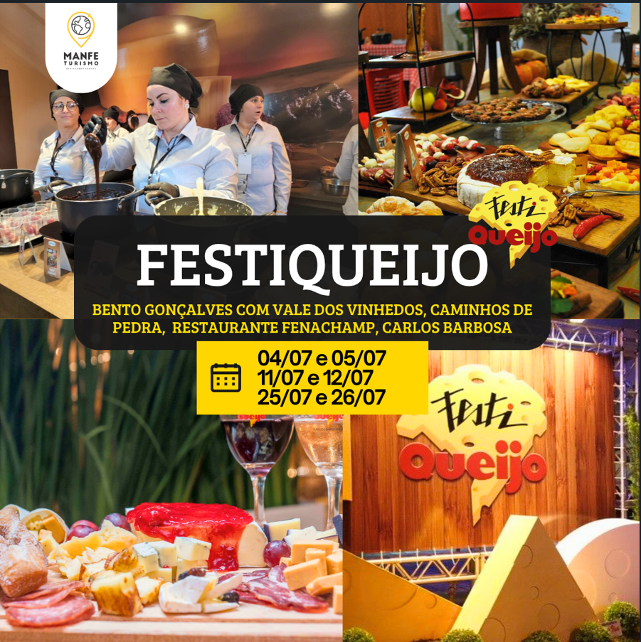 Cidades origens / Bento Gonçalves - Caminhos de Pedra / Garibaldi / Carlos Barbosa Festiqueijo: Saída nos locais e horários combinados com destino a Bento Gonçalves com paradas para embarques e café da manhã já programadas. 07:00 horas – Parada para Café da manhã. 08:00 horas – Chegada em Bento Gonçalves - Parada Pórtico da Cidade para Fotos. 09:00 horas - Início do Tour pelos Caminhos de Pedra – Paradas: Casa da Erva Mate, Casa das Cucas, Casa das Massas, Varejo Vinícola Strapazzon, Varejo Casa da Ovelha. 12:00 horas – Parada para Almoço – Já incluso, sem bebidas. 13:30 mints – Visita a Vinícola Aurora com degustação. 15:00 horas – Acomodações hotel. Tarde livre para aproveitar a estrutura do hote e descanso. 18:30 mints – Saída para Festiqueijo. 19:00 horas – Entrada evento Festiqueijo. 23:00 horas – Retorno ao hotel após término Festiqueijo.