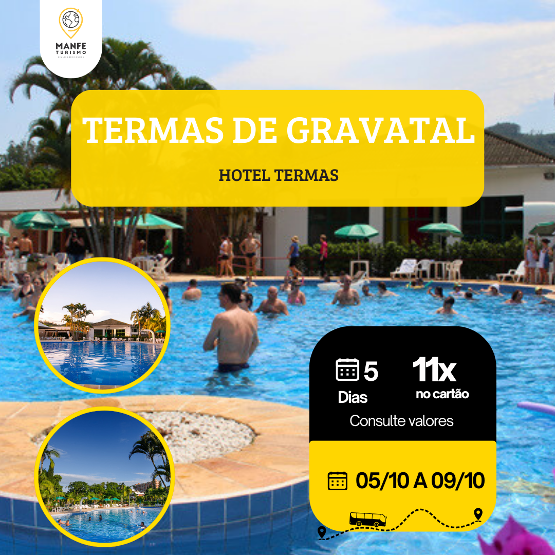 GRAVATAL: Dia e noite inteiramente livre para usufruir deste encantador lugar, não esquecendo também da alta qualidade, variedade e abundância que são características marcantes da cozinha de Gravatal. Pratos regionais que são servidos nas três principais refeições – café da manhã, almoço e jantar – todas incluídas nas diárias. Dentro do complexo Termal, o hóspede ainda encontra sala de jogos, teatros, música ao vivo, roda de viola, além das atividades diárias organizadas pela equipe de recreação. Aproveite para descansar, aproveitar as piscinas Termais do hotel, fazer caminhadas, visitar o morro do mirante, aproveite a sauna, sala de massagem, sala de ginástica, à noite curtir os bailinhos, ou ainda, tentar a sorte no salão de jogos com bingos e carteados. Passeios opcionais serão oferecidos durante a semana até as cidades vizinhas de São Martinho e Laguna e também o passeio a serra do Rio do Rastro. Os Hotéis oferecem além da estrutura de piscinas acesso livre ao parque aquático, este que é abastecido com água a uma temperatura média de 36 graus. Aproveite a semana toda e participe das atividades monitoradas que o hotel tem a oferecer. As piscinas são minerais emergentes de fontes naturais, totalmente renovadas a cada 12 horas. Com uma temperatura de 36ºC, proporcionam banhos pela manhã, tarde e noite.