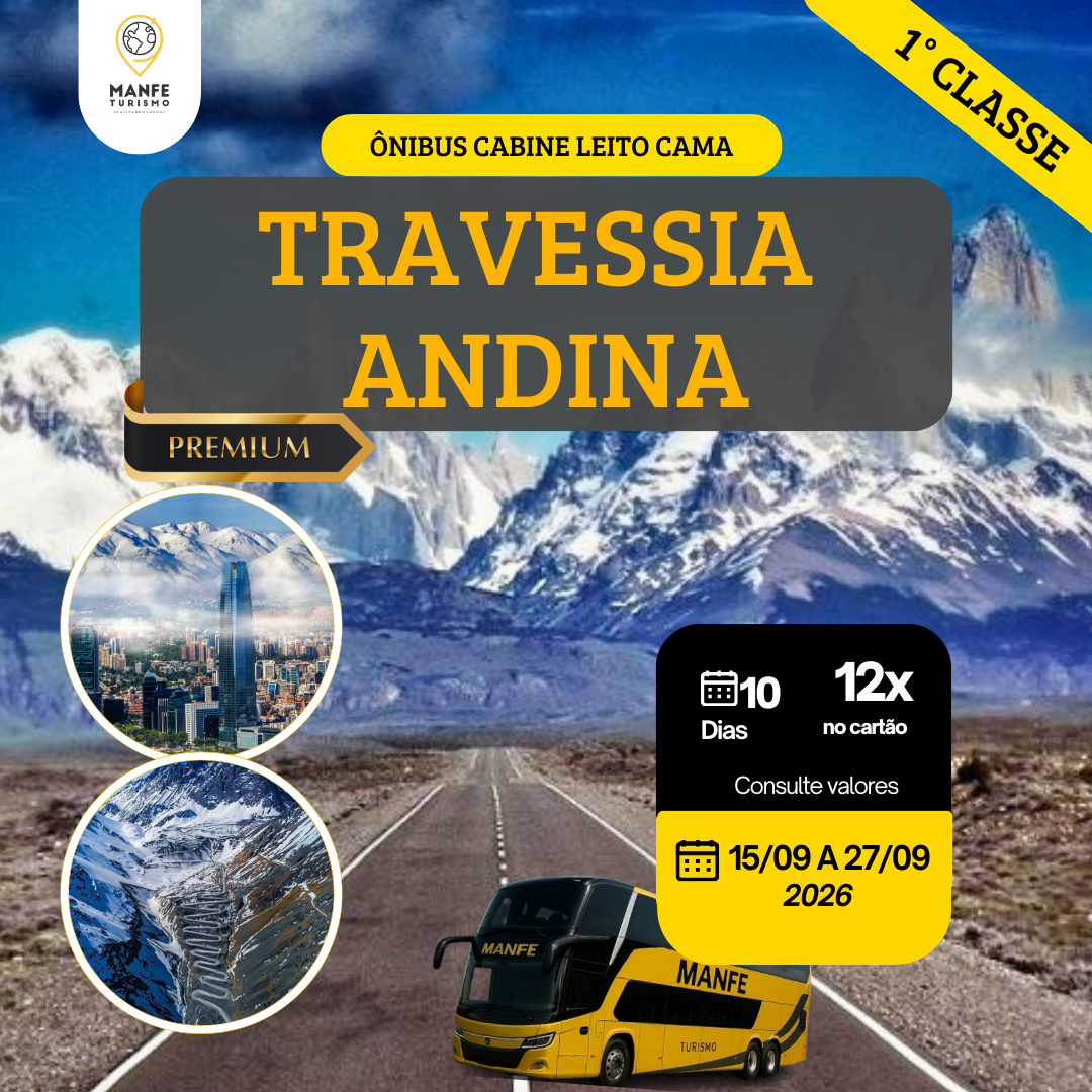 18/09 - MENDOZA ARG X SANTIAGO CHI (365 KM): Após o café da manhã desocuparemos o hotel, neste dia realizaremos a cruzada da Cordilheira dos Andes, passando por Los Penitentes, Puento Del Inca, mirador do Aconcágua, Las Cuevas, travessia do túnel binacional Cristo Redentor, a 3.200 mts de altitude e ingresso no território Chileno passando pelo importante centro de esqui em PORTILLO e a magnífica descida dos CARACOLES (Parada para trâmites aduaneiros). Chegada a tardinha em SANTIAGO diretamente ao hotel. Noite livre. Pernoite em Santiago.
