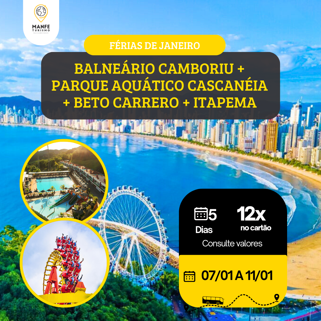 BALNEÁRIO CAMBORIU + PARQUE AQUÁTICO CASCANÉIA + BETO CARRERO + ITAPEMA