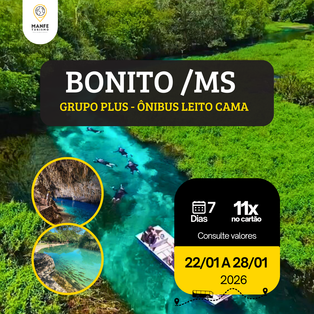 04° DIA – 25/01 - BONITO MS / BALNEÁRIO MUNICIPAL:Café da manhã. Sugerimos antes da ida ao Balneário Municipal o passeio opcional pela Gruta Catedral. As 10:30 mints saída para o Balneário Municipal (Ingresso já incluso), este que é uma área de lazer belíssima com diferentes atividades para passar um tempo agradável em meio a natureza. Tem diferentes opções para serem feitas, entre elas mergulhar e banho pelo Rio Formoso, tomar banho de sol e praticar alguns esportes. O local possui churrasqueiras e mesas, enquanto clientes aproveitam o local motoristas e guia preparam um churrasco para o grupo. A tardinha acomodações. Noite livre. Pernoite em Bonito.