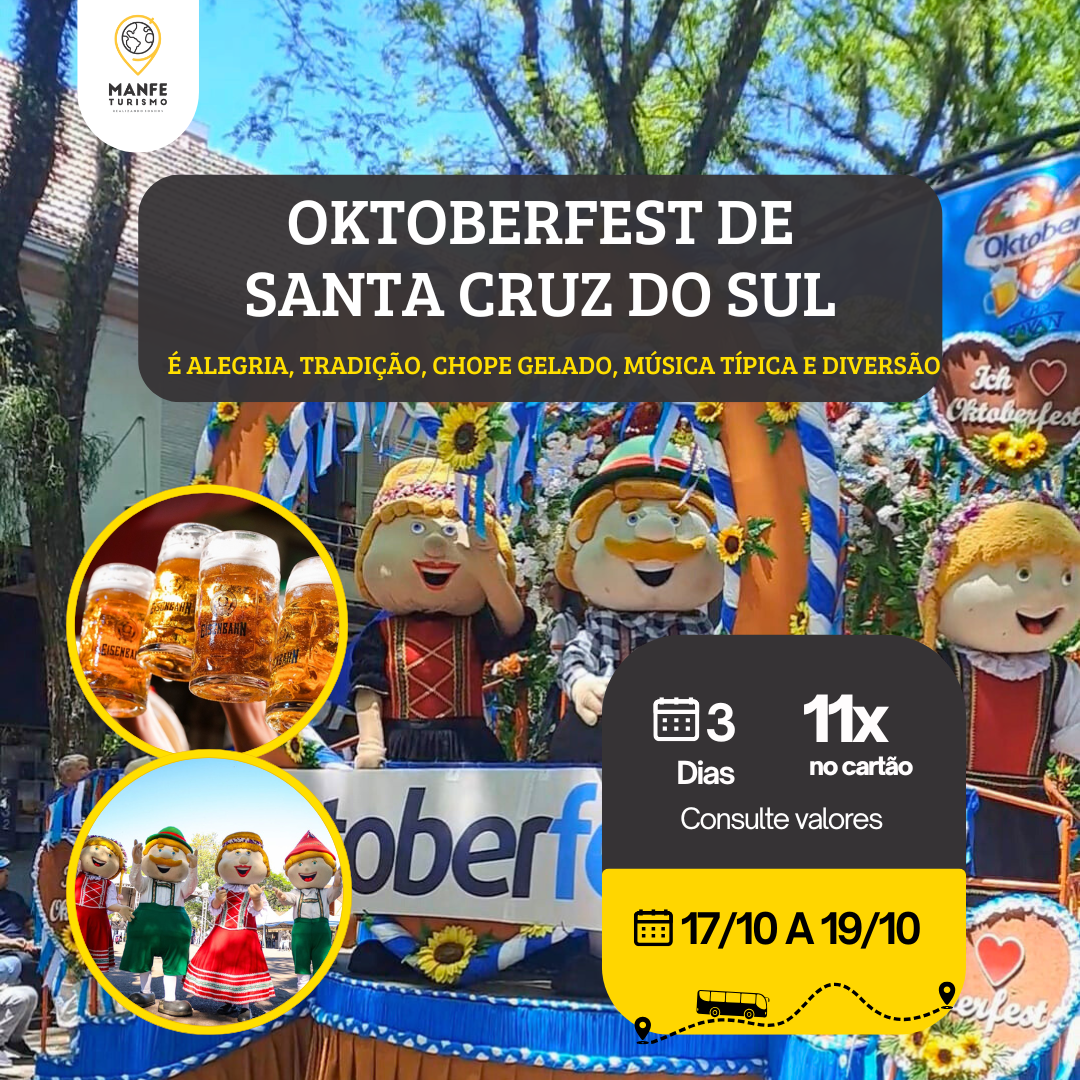 SEXTA FEIRA – SANTA CRUZ / OKTOBERFEST: Saída nos locais e horários combinados com destino a Santa Cruz do Sul. Chegada por volta de 12:30 mints diretamente ao centro da cidade. Tempo livre para almoço e conhecer a região. A tarde Acomodações. Tarde livre para atividades particulares. Hotel possui piscina. A noite sugerimos aproveitar os pavilhões da Oktoberfest e shows nacionais (Pavilhões da festa a 10 mints caminhando do hotel).