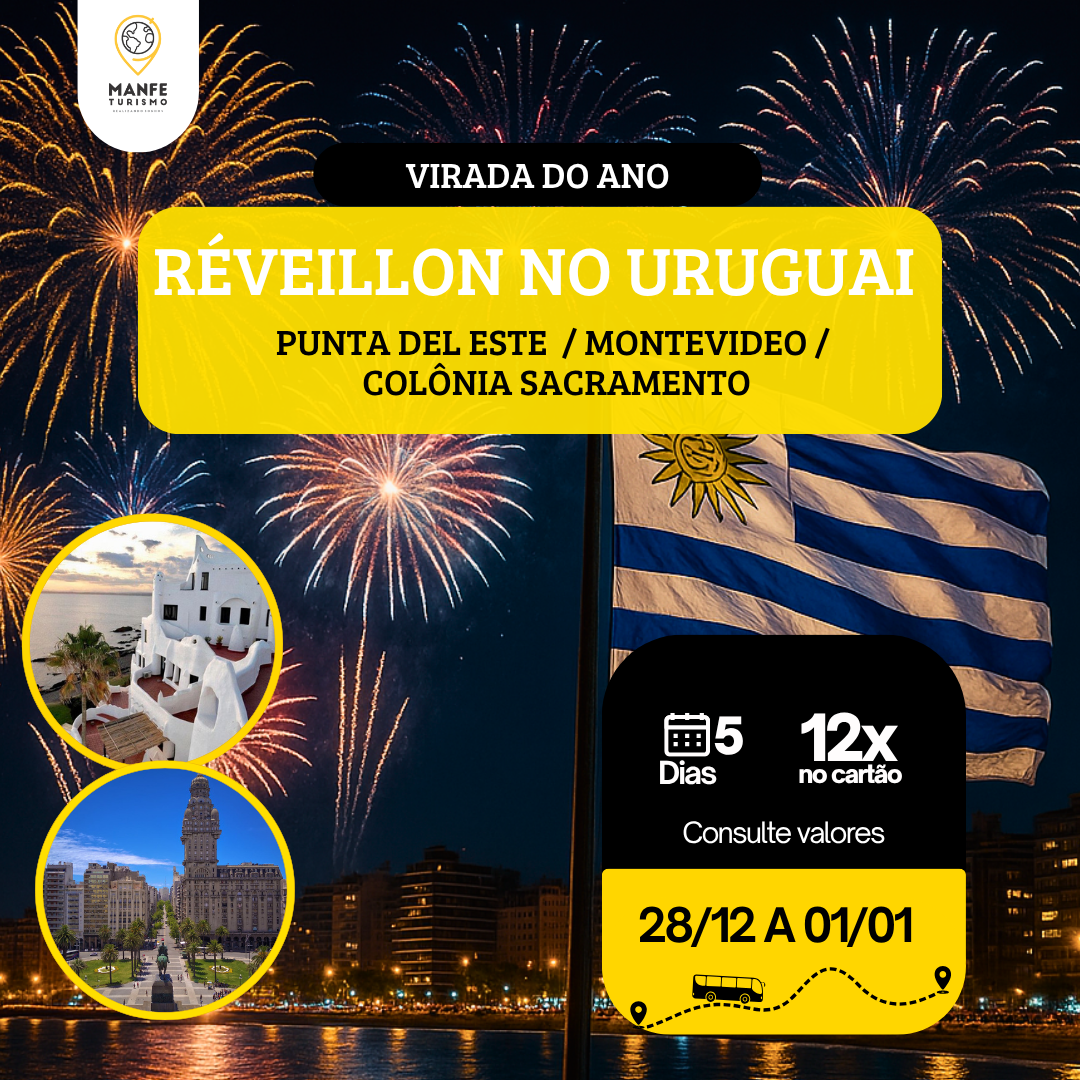 28/12 – DOMINGO - Brasil / Uruguai: Saída nos locais e horários combinados com destino a Punta Del Este. Paradas para embarques, aduana e refeições já programadas.